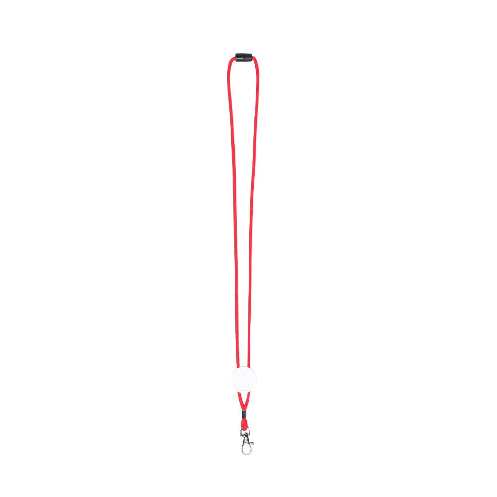 Lanyard mit robuster Kordel aus weichem Polyester in verschiedenen lebendigen Farben. Mit Klickverschluss am Nacken, Befestigungskarabiner aus Metall und zentraler Fläche zum Bedrucken.