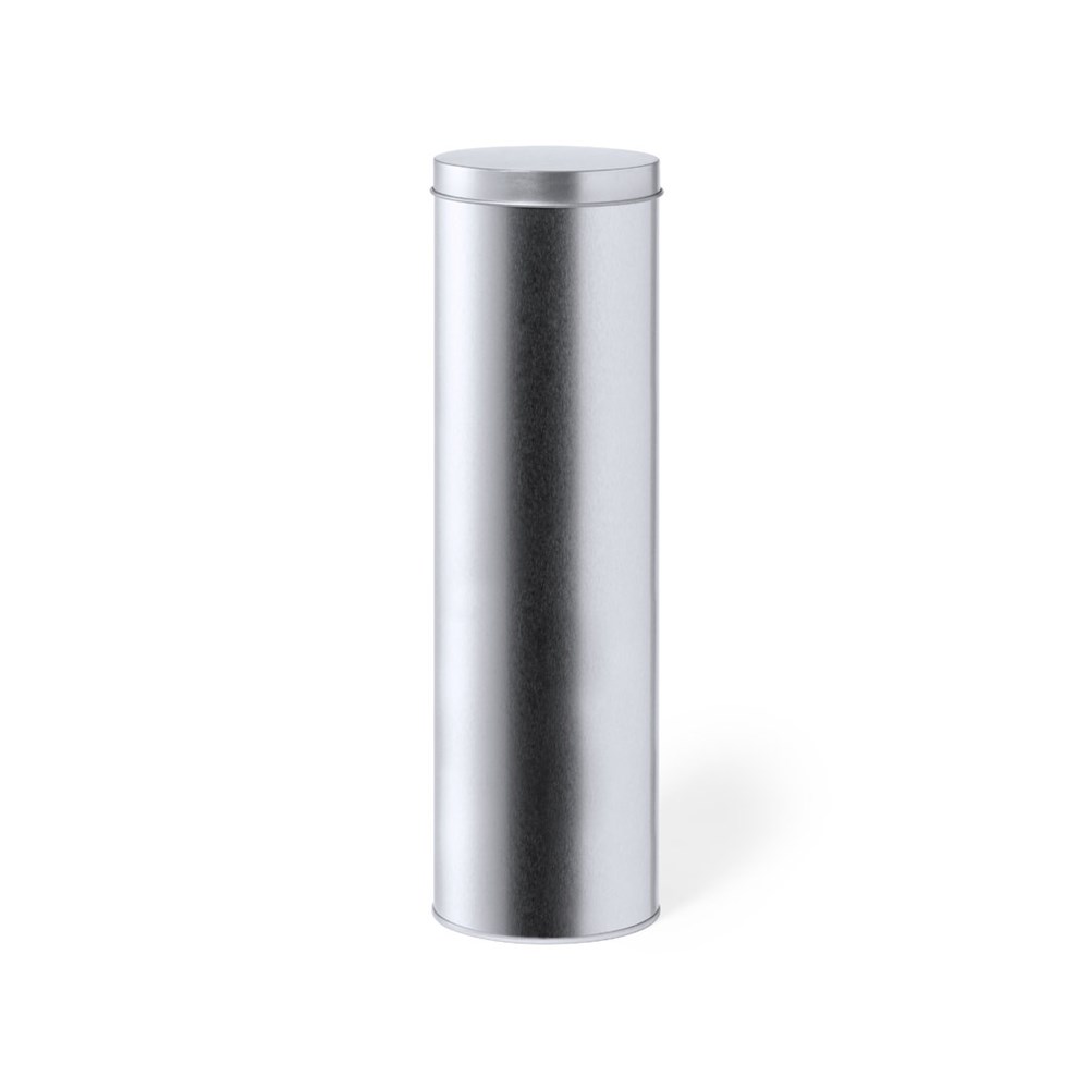 Zylindrische Präsentationsbox aus robustem, silberfarbenem Metall mit passendem Deckel.