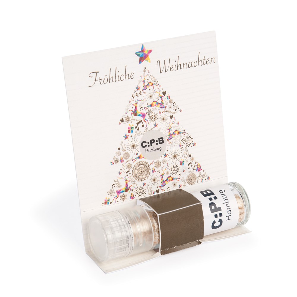 Originell, stimmungsvoll und effektiv – die Zuckermühle in weihnachtlich gestalteter Einsteckkarte besitzt viel Aufmerksamkeitspotenzial. Das große Format (105 × 148 mm) der Karte bietet dabei genug Platz für Ihre individuelle Weihnachtsbotschaft. Sie kann beidseitig nach Ihren Wünschen und Vorstellungen gestaltet und vierfarbig bedruckt werden, auf der Rückseite z. B. mit leckeren weihnachtlichen Koch und Backrezepten. Zusätzlich können Sie auf der Mühlen-Banderole Ihr Logo, Ihren Slogan oder ein sonstiges Motiv platzieren und erhalten in Kombination mit der Einsteckkarte einen besonderen Werbeträger, der Ihre Botschaft direkt und sicher an den Kunden weiterleitet.