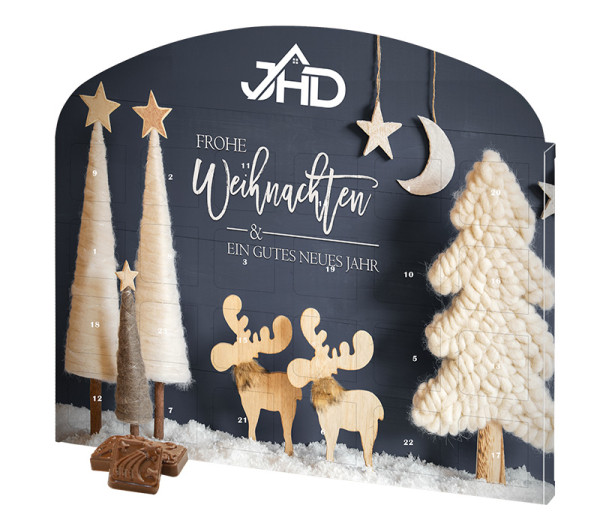 Tisch-Adventskalender im Kundendesign mit ausklappbarem stabilen Standfuß. Ausgestanztes Loch zum Aufhängen an der Wand.