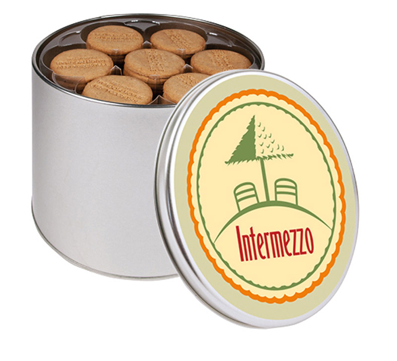 Runddose, befüllt mit runden, im Blister gestapelten Keksen mit individueller Werbeprägung. Zusätzlich zur Prägung der Kekse mit Ihrer Werbebotschaft versehen wir den Dosendeckel mit einem individuell bedruckten, runden Etikett – oder bedrucken den Deckel direkt mit Ihrem Motiv.
