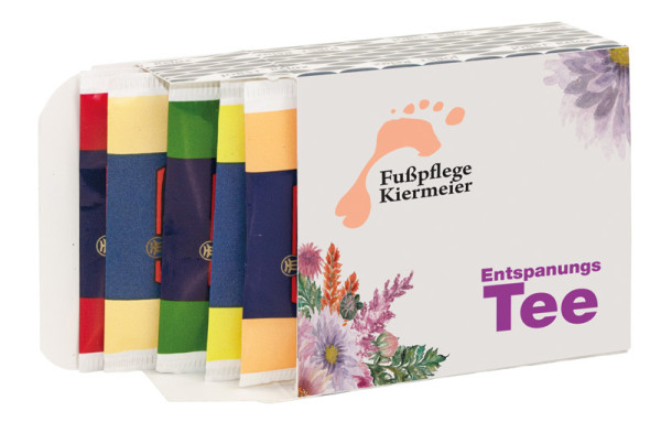 Wiederverschließbare Schachtel gefüllt mit 5 Meßmer Teebeuteln. Werbeanbringung auf 5 Außenseiten... mehr