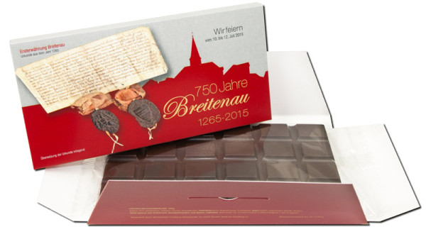 Einen 4-fbg. bedruckte Umschlag gefüllt mit: 100 g Schokoladentafel in Confiserie-Qualität einzeln in Klarsichtfolie aus Edle Vollmilchschokolade oder Edle Zartbitter-Schokolade, eine 100 g Lindt-Lindor Milch Schokotafel oder eine 100 g Schwarze Herren Schokolade - Edelbitter, 100 g.