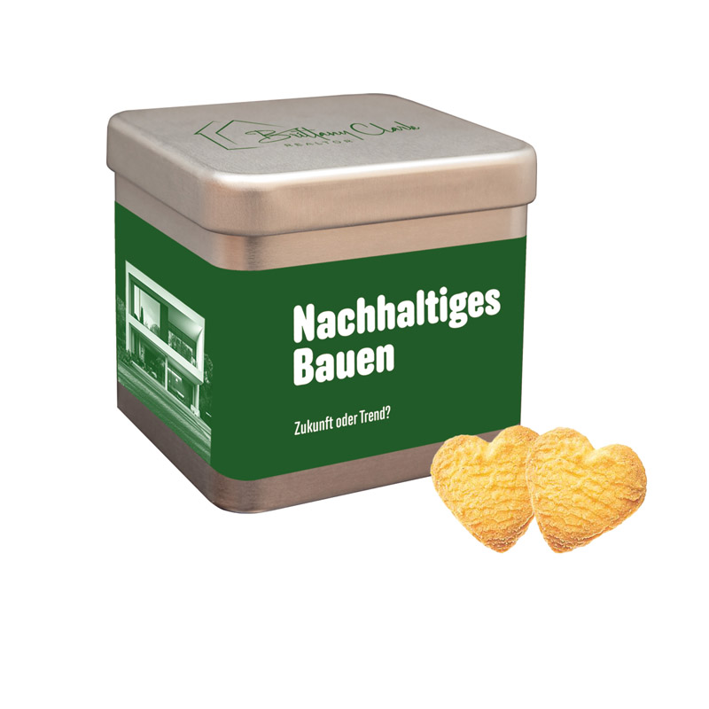 Silbermatte, quadratische Dose mit drei Veredelungsoptionen: Sie haben die Wahl zwischen Direkt-Digitaldruck auf dem Deckel, einem vierfarbigen 4-C-Etikett am Korpus oder einer Kombination aus beiden Veredelungen für maximale Markenwirkung.. Befüllt wird diese kompakte Dose mit Butterherzen der Marke Coppenrath. Der Vorteil bei dieser Füllung ist, dass man die Dose zu jeder Jahreszeit einsetzen kann. Ob Sommer, Herbst, Winter oder Frühling, diese Butterherzen sind ein Genuss für jeden Gaumen.
