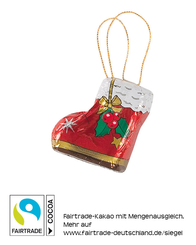 Schokoladen-Nikolausstiefel in bedruckter Folie. Fairtrade Edelvollmilchschokolade, mindestens 33% Kakao.