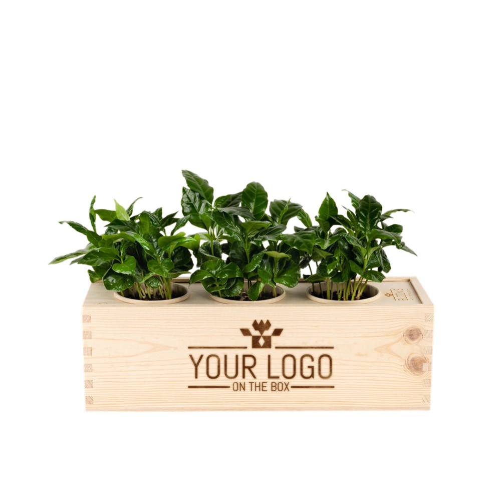 Material: Holzkiste (41 x 13 x 13 cm), gefüllt mit drie Kaffeepflanzen. Die fsc-Holzkiste ist gleichzeitig die Versandverpackung, der Pflanzentopf und das Wasserreservoir für die Pflanzen. Wir verwenden ausschließlich nachhaltige, wenn möglich recycelte Materialien und gleichen den (begrenzten) ökologischen Fußabdruck der Boxen aus.