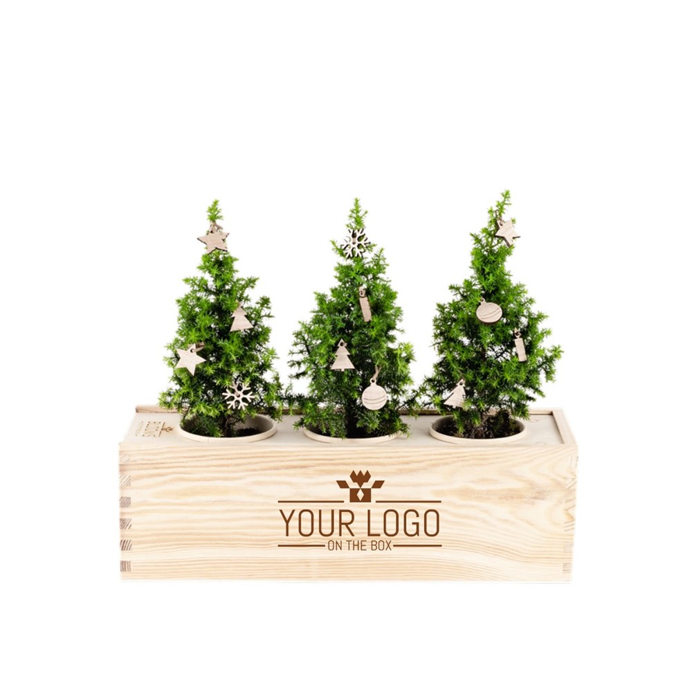 | Material: | Holzkiste (41 x 13 x 13 cm), gefüllt mit drie Weihnachtsbäume mit Weihnachtsschmuck aus Holz. Die fsc-Holzkiste ist gleichzeitig die Versandverpackung, der Pflanzentopf und das Wasserreservoir für die Pflanzen. Wir verwenden ausschließlich nachhaltige, wenn möglich recycelte Materialien und gleichen den (begrenzten) ökologischen Fußabdruck der Boxen aus. |
