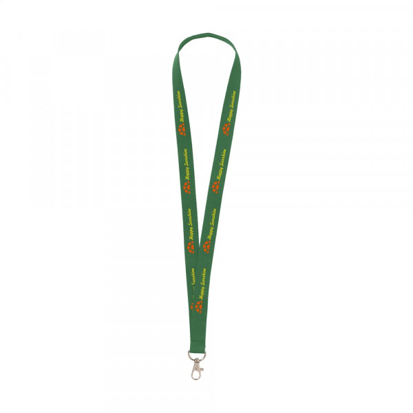Schlüsselband aus Polyester mit Karabinerhaken aus Metall.