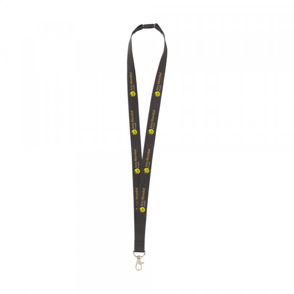 Umhängeband aus Polyester mit Karabinerhaken aus Metall und Sicherheitsverschluss.