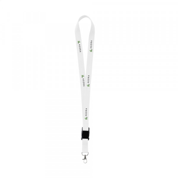Schlüsselband aus stark gewebtem Polyester mit Karabinerhaken aus Metall. Der untere Teil lässt sich durch ein Klicksystem aus Kunststoff abtrennen.