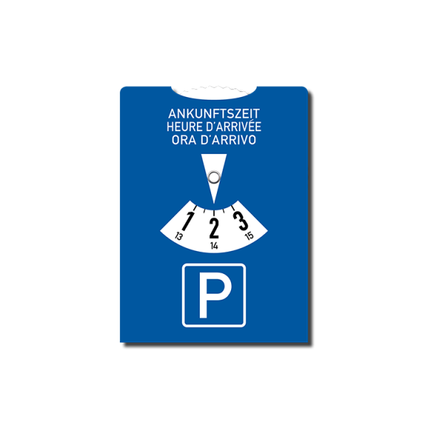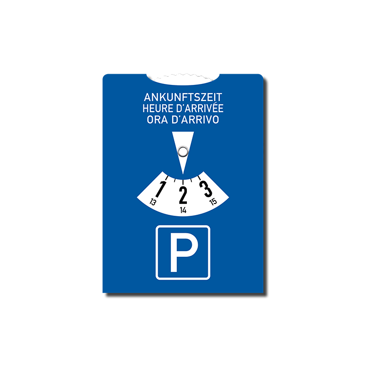 Parkscheibe (CH – 3sprachiger Vorderseite) mit kompletter Rückseite