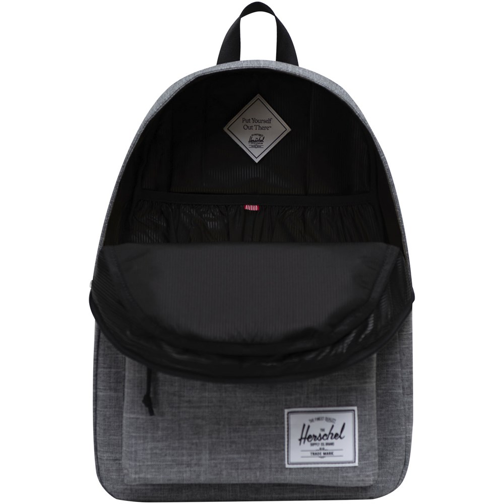 Bereiten Sie sich mit dem Herschel Classic™ Rucksack auf Ihren nächsten Ausflug vor, denn er bietet ausreichend Platz für alles Wichtige. Der Rucksack wurde fachmännisch aus 100 % EcoSystem™ Materialien gefertigt, damit Sie Ihre Abenteuer mit gutem Gewissen erleben können. Das 600D Material wurde aus 100 % recycelten Wasserflaschen hergestellt und ist außergewöhnlich strapazierfähig. Im Inneren des Rucksacks befindet sich ein gepolstertes, flexibles Fach, in dem ein 15"/16" Laptop sicher verstaut werden kann. Die verstellbaren und gepolsterten Schultergurte sorgen für Komfort auf langen Reisen. Der Rucksack verfügt über ein separates Fach für die Wasserflasche und eine Vordertasche, in der sich kleinere Gegenstände bequem verstauen lassen. Mit einem voluminösen Fassungsvermögen von 26 Litern ist der Herschel Classic™ Rucksack der perfekte Begleiter für jedes Abenteuer.