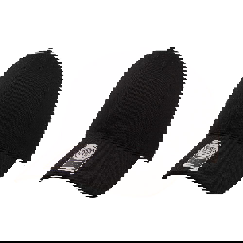 6 Panel Cap ohne Frontfütterung. Low profile. Mattschwarze Schnalle und Öse. Hergestellt aus recycelter Baumwolle