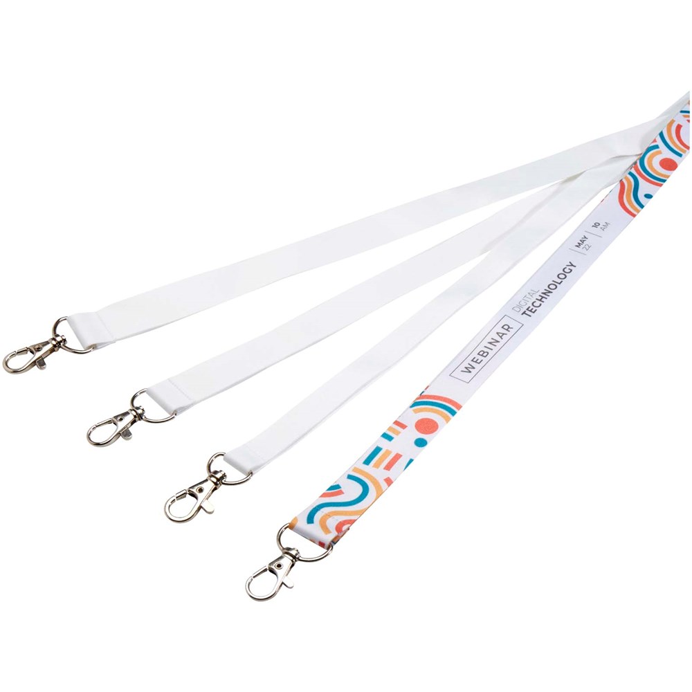 Addie vollfarbig bedrucktes Sublimation Lanyard. Der Druck ist ein- oder beidseitig möglich. Beim beidseitigen Druck können Sie zwischen der Standard- und der Fitted-Option wählen (Fitted bedeutet, dass der Druck auf beiden Seiten ausgerichtet ist). Das Lanyard hat einen Metallhaken und einen Abreißverschluss für z. B. Namensschilder, Ausweise oder Schlüssel. Verfügbar in vier Bandbreiten: 10, 15, 20 und 25 mm.