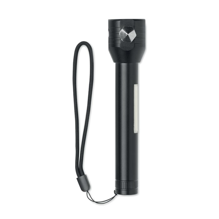 3in1 Taschenlampe mit Notfallhammer und Gurtschneider. Aluminium. Seitliches und frontales COB-Licht. Inkl. Magnet, Handschlaufe und wiederaufladbarem 500mAh-Akku.