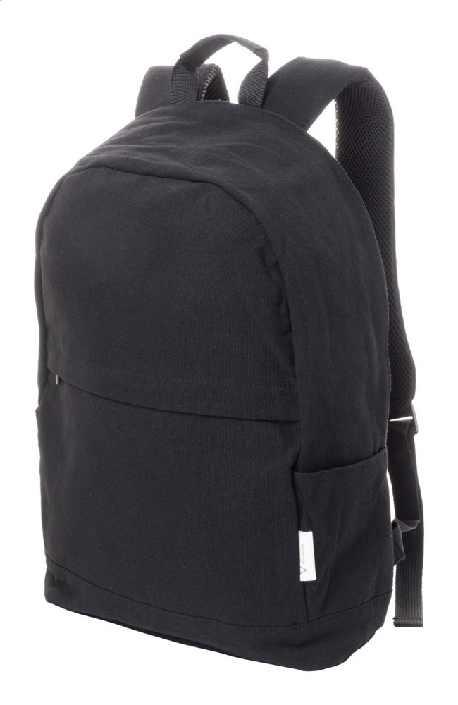 Rucksack aus recycelten Canvas mit Hauptfach mit Reißverschluss, gepolstertem Laptopfach (15"), Vordertasche mit Reißverschluss, Seitentaschen, Trolley-Gurt, gepolstertem Rücken und Schultergurten. Mit versteckter Diebstahlschutztasche. 70 % recycelter Baumwolle und 30 % RPET-Polyester. Mit Label recycelte Baumwolle.