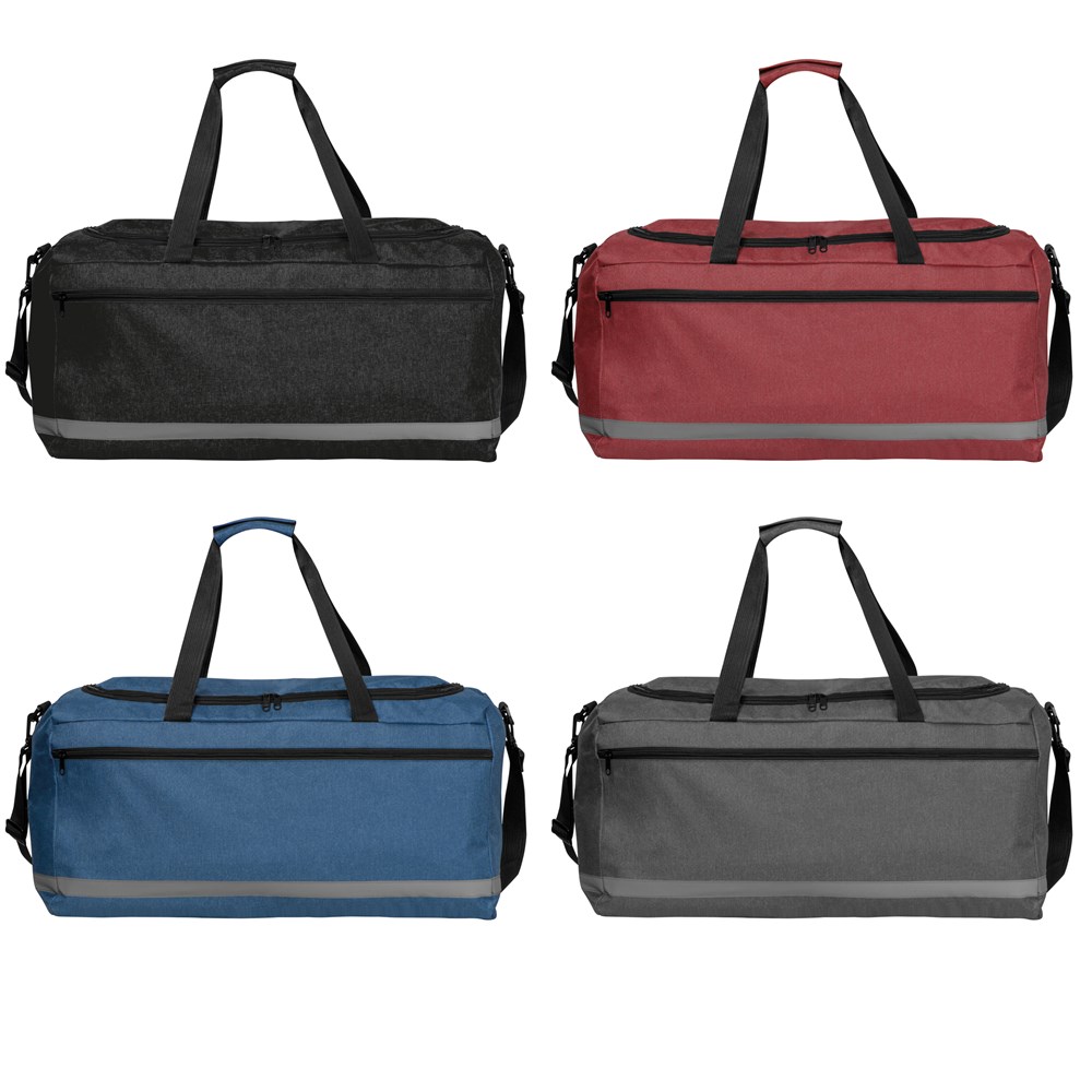 Große Sporttasche aus 600D Polyester mit Reflektorstreifen. Neben dem geräumigen Innenfach verfügt die Tasche noch über ein zusätzliches Reißverschlussfach an der Seite. Die beiden Tragegriffe sowie der verstellbare Schultergurt sorgen für einen bequemen Transport. Ihre Werbung drucken wir auf das Reißverschlussvorfach.