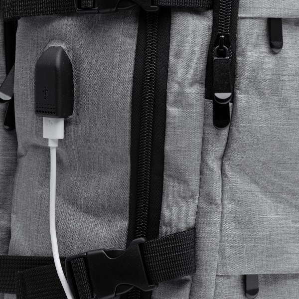 Reiserucksack aus recyceltem RPET-Polyester, entworfen für Komfort und Funktionalität. Mit gepolstertem Rücken und Griffen, 2 Außentaschen vorne und 3 großen Hauptfächern. Enthält ein gepolstertes 17,3"-Laptopfach, eine USB-Buchse mit Micro-USB-Kabel zum Anschluss einer Powerbank (nicht im Lieferumfang enthalten) und ein atmungsaktives Schuhfach. Mit einer Anti-Diebstahl-Tasche auf der Rückseite und einem Trolley-Gurt bietet er ein Fassungsvermögen von 30 Litern für organisiertes und sicheres Reisen.