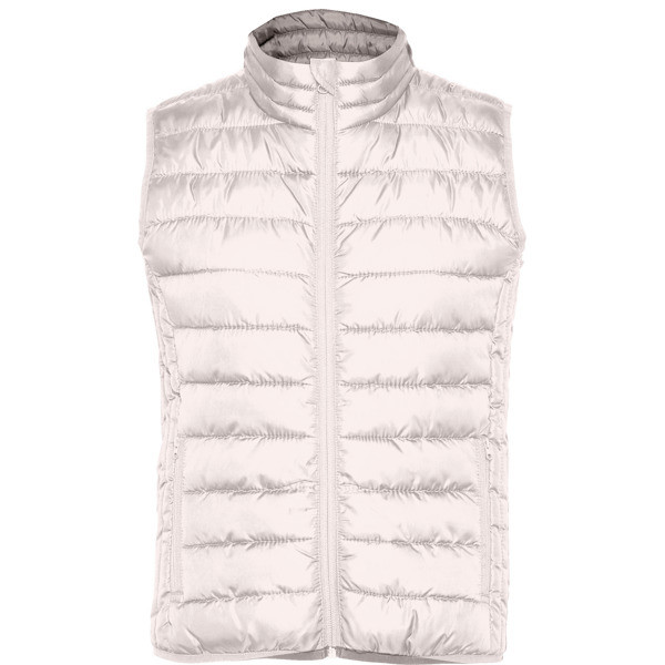 Wasserdichte gepolsterte Weste. farblich invertierter Frontreißverschluss mit Kinnschutz aus demselben Stoff. Seitentaschen mit farblich umgekehrten Reißverschlüssen, die in die geformten Seitenteile eingelassen sind, für eine taillierte Passform im Brustbereich. Farblich umgekehrte, elastische Paspeln an Armausschnitten und Saum. Futter in Vollton- und Kontrastfarben.