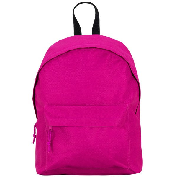 Basic Rucksack aus strapazierfähigem Material. 1. Doppelter Schultergurt und Tragegriff in Kontrastfarbe. 2. Haupt- und Fronttasche mit Reißverschluss, Zipper und Puller Ton-in-Ton.