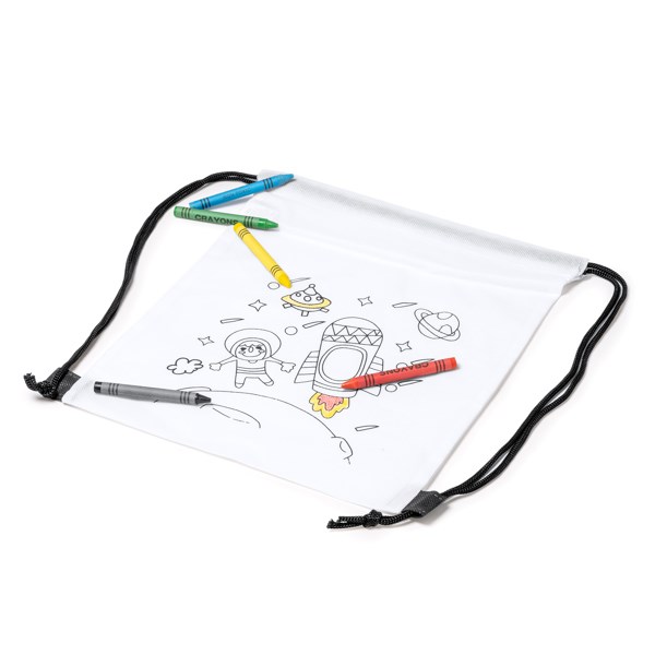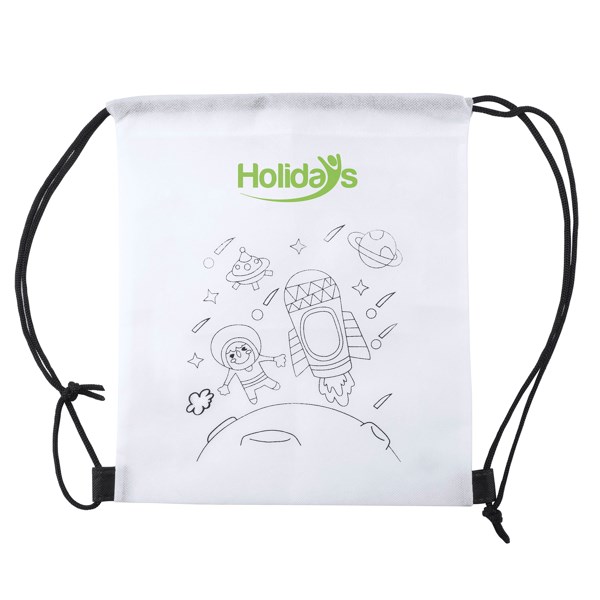 Turnbeutel für Kinder aus Non-Woven mit Kordelzug. Der Turnbeutel mit ausmalbarem Motiv. Stifte in 5 verschiedenen Farben inklusiv.