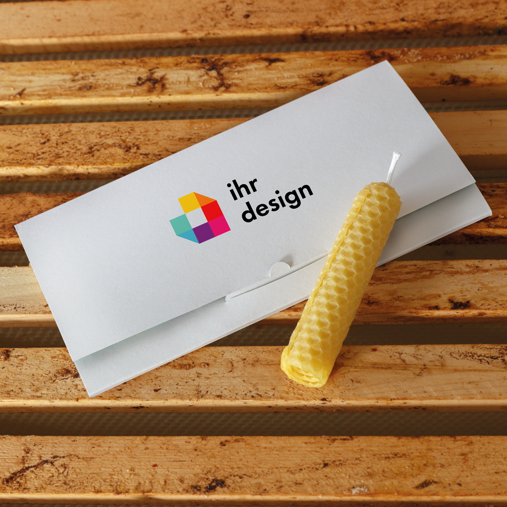 Wie geschaffen als Weihnachtskarte oder als Gruß in der Adventszeit. Mappe aus Karton für DIN lang mit einem Bastelset für eine Bienenwachskerze. Fertig konfektioniert mit Anleitung und Sicherheitshinweisen. Ausgezeichnet mit dem Promotional Gift Award 2023.