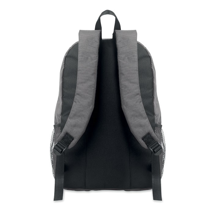 Rucksack mit Schnürung. Fronttasche mit Reißverschluss. Netztaschen auf beiden Seiten. 600D RPET-Polyester.