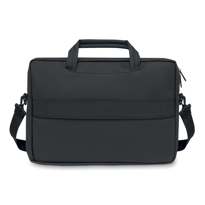 15'' Laptop Tasche aus weichem PU. Inkl. gepolstertes Laptop-Fach, Fronttasche mit Reißverschluss und diverse Fächer. Futter 210D RPET-Polyester. 2 Griffe, abnehmbarer und verstellbarer Schultergurt. Rückseitige Trolley-Halterung.