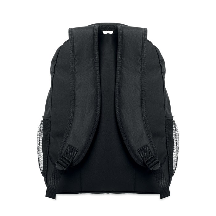 15'' Laptop-Rucksack aus 600D RPET-Polyester mit gepolstertem Laptopfach. Beidseitige Netztaschen und Reißverschlusstasche vorne.