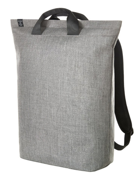 gradliniger, moderner Rucksack; Reißverschluss-Hauptfach mit gepolstertem Notebookfach; rPET Obermaterial; wertige Metall-Accessoires; gepolsterter Boden; aufwändig gepolsterter Rücken mit verstecktem Reißverschlussfach; längenverstellbare gepolsterte Schultergurte mit Gummischlaufen zum Befestigen von z.B. Sonnenbrille; Handgriffe