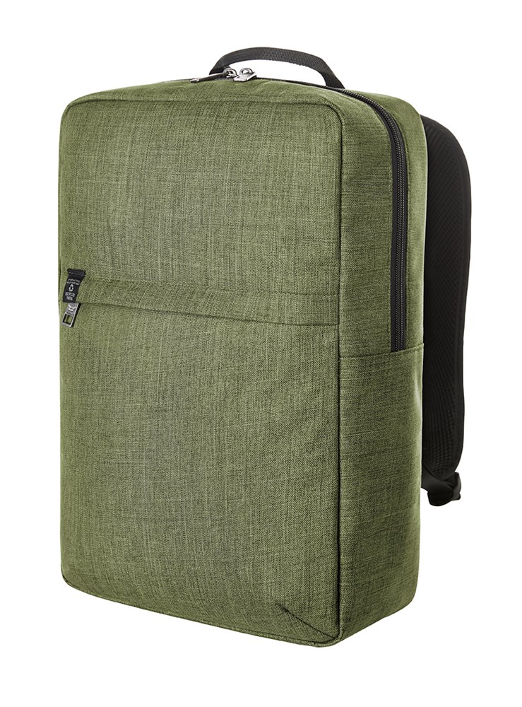gradlinig gearbeiteter Rucksack; rPET Obermaterial; großes Hauptfach mit 2-Wege-Reißverschluss und gepolstertem Notebookfach; Reißverschluss-Vortasche; aufwändig gepolsterter Rücken mit verstecktem Reißverschlussfach; längenverstellbare gepolsterte Schultergurte mit Gummischlaufen zum Befestigen von z.B. Sonnenbrille; Handgriff