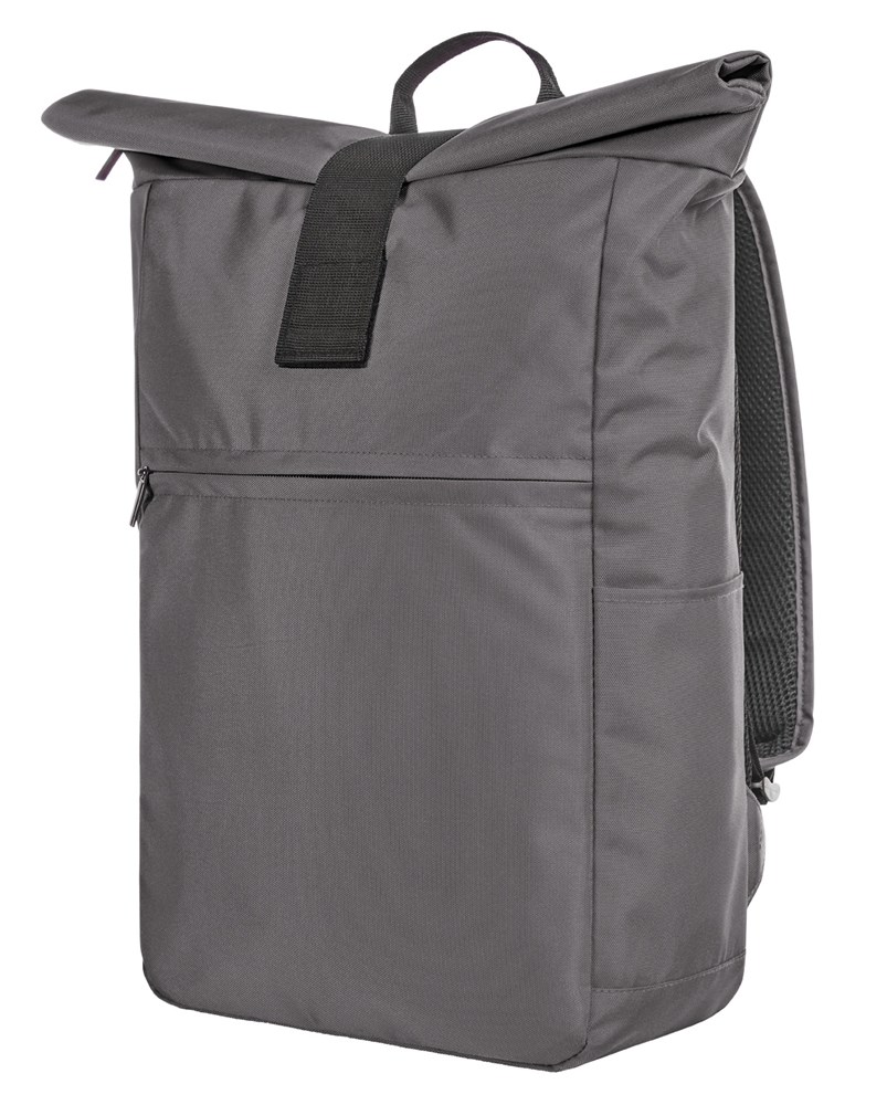 urbaner Überschlag-Rucksack; großes Hauptfach mit Reißverschluss und zusätzlicher Klettlasche; RPET-Obermaterial; gepolstertes Notebookfach und flaches Einsteckfach innen; große Reißverschluss-Vortasche auf der Front; zwei seitliche Einsteckfächer für z.B. Trinkflaschen; gepolstertes Tragesystem; Handgriff