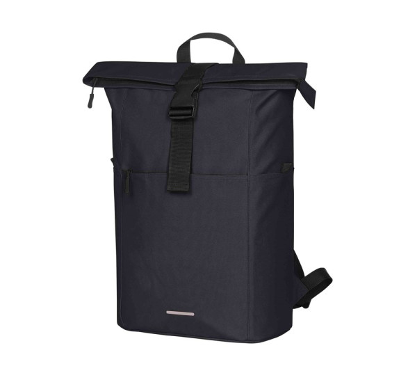 praktischer Roll-Top Rucksack; recycelter Oberstoff; großes Hauptfach mit Reißverschluss und zusätzlichem Steckverschluss; attraktiver Reflexdruck; RPT-Obermaterial; großes gepolstertes Einsteckfach; Airtag-Einsteckfach; große Reißverschluss-Vortasche auf der Front; zwei seitliche Einsteckfächer für z.B. Trinkflasche; gepolstertes Tragesystem; Handgriff