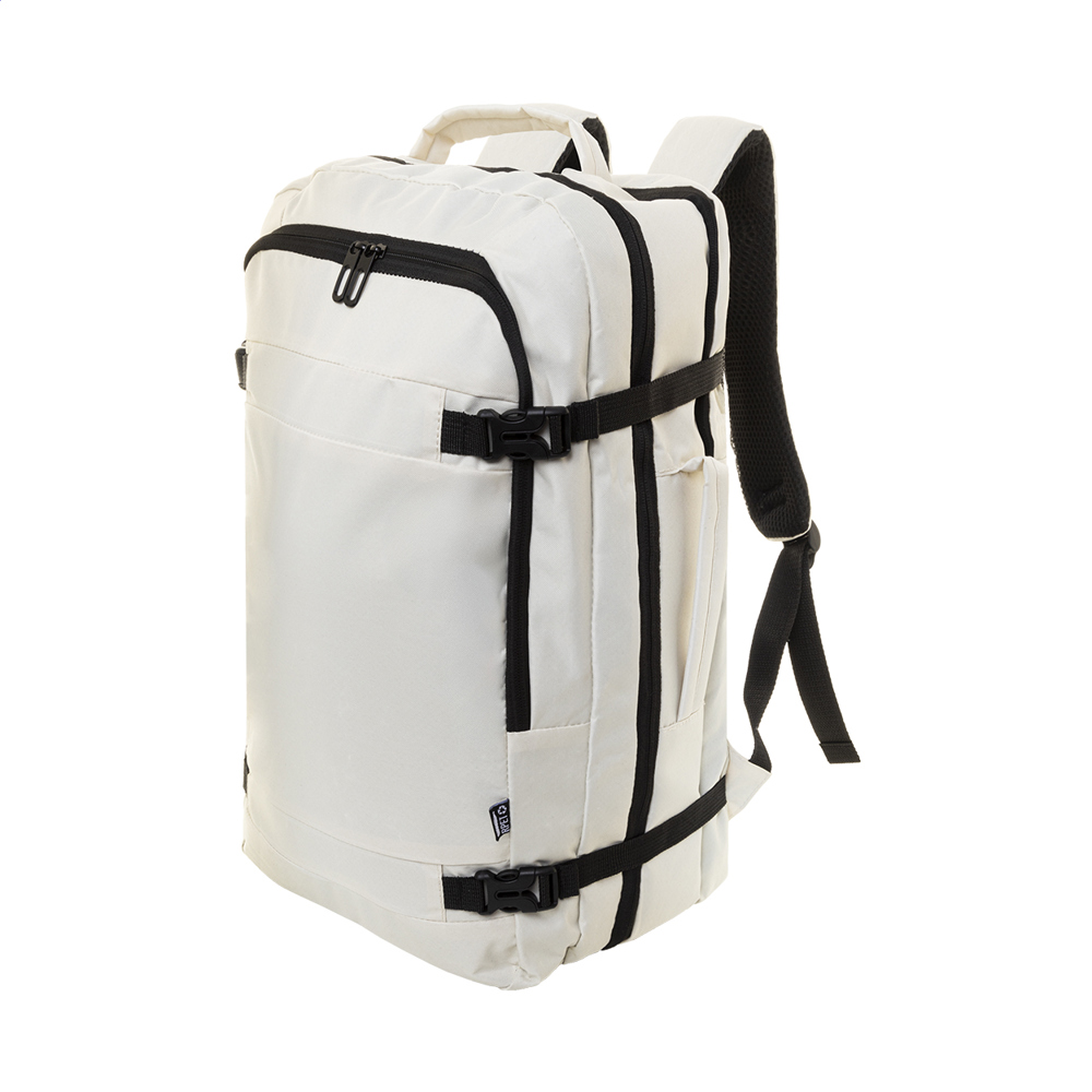 RPET-Rucksack mit Doppelfunktion und Dokumententasche mit 2 Reißverschlussfächern, Reißverschluss-Vortasche und gepolstertem Laptopfach (15"). Mit Anti-Diebstahl-Tasche, Trolley-Gurt, gepolstertem Rücken und Schultergurten. Material: 600D RPET-Polyester. Mit RPET-Label.