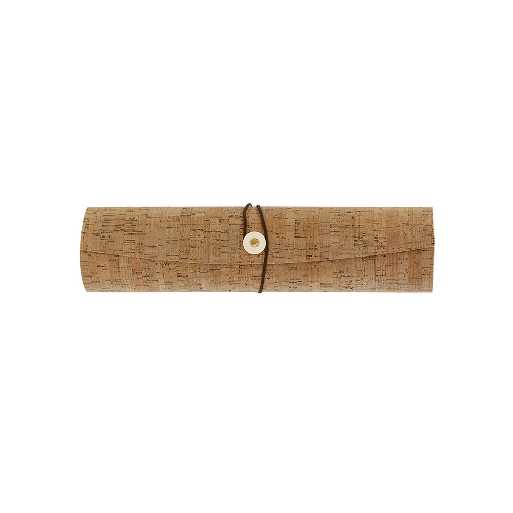 Präsentationsbox mit Innenausstattung aus Naturholz und Außenverkleidung aus Kork. Mit braunem Riemenverschluss.