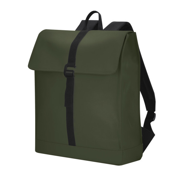 Rucksack aus weichem PU. Mit Haupttasche und Schnallenverschluss. Innenraum mit großer Kapazität und gepolstertem Fach für Laptops bis zu 14 Zoll oder Tablets bis zu 10 Zoll. Gepolsterter Rücken und Riemen. Inklusive Trolley-Gurt.