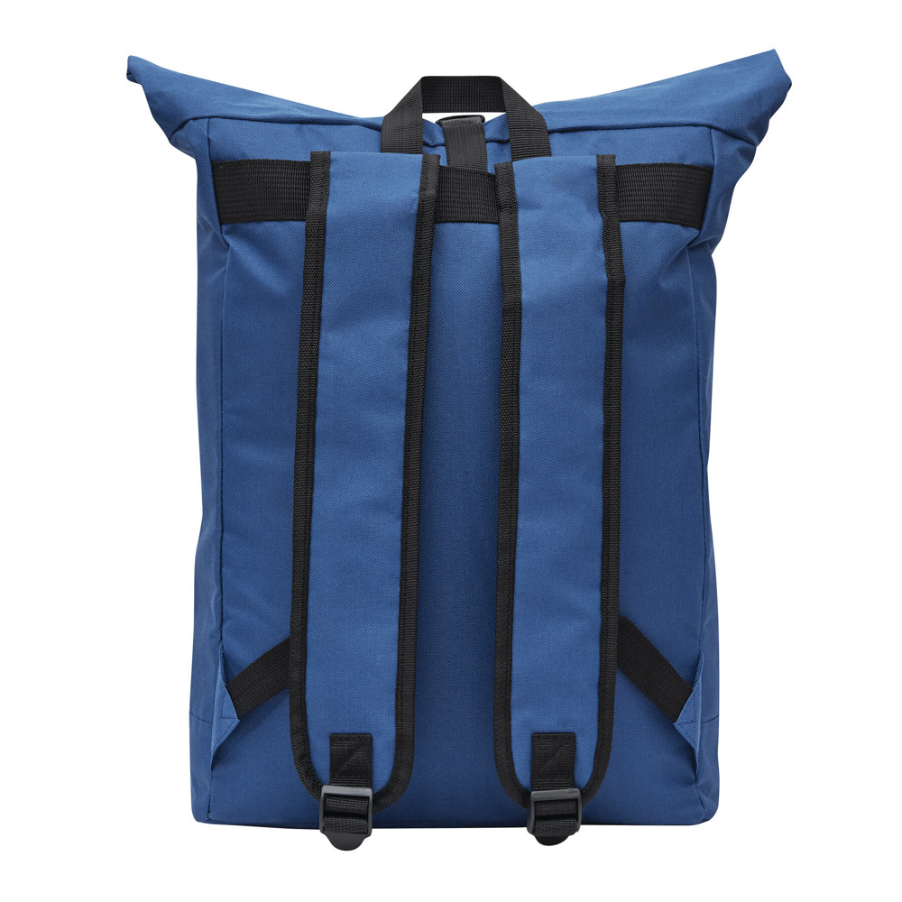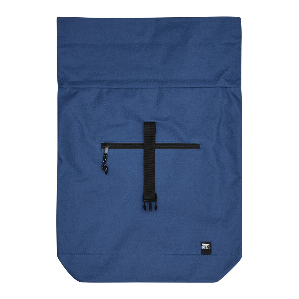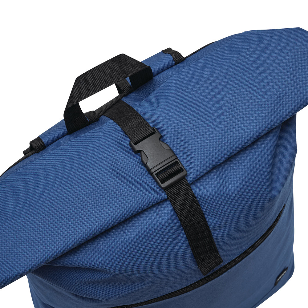 Rucksack ROLL-TOP: aus recyceltem Kunststoff (RPET), horizontales Reißverschluss-Vorfach, großes Hauptfach mit gepolstertem Innenfach für Laptop oder Tablet, aufrollbar und mit Schnappverschluss verschließbar, Trageschlaufe, gepolsterter Boden, Schultergurte und Rückenbereich