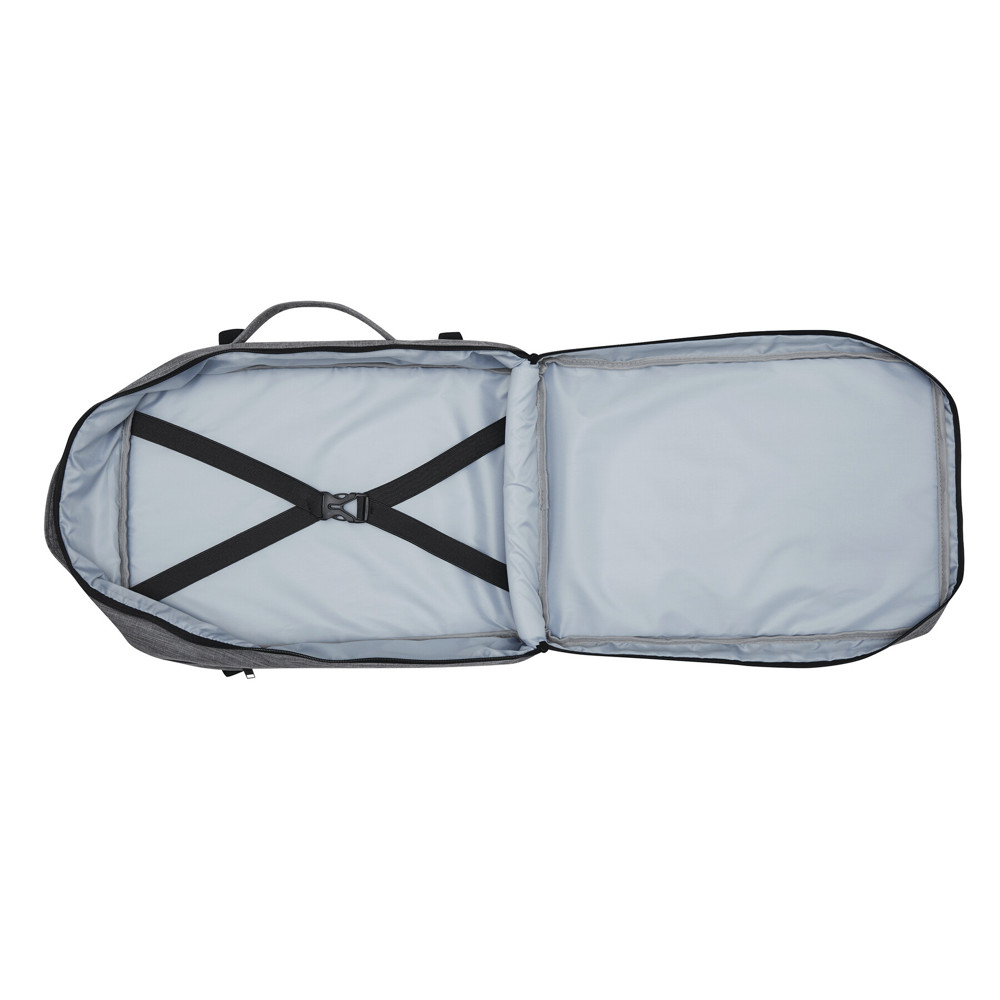 Rucksack STEWARD: 2 Reißverschluss-Vorfächer, eins davon mit Organizer (3 Steckfächer, 2 Stifteschlaufen), 1 großes gepolstertes Reißverschluss-Hauptfach mit Packgurt, 1 gepolstertes Reißverschluss-Laptopfach, jeweils 1 verstärkter Top- und Seitengriff, gepolsterte Schultergurte in ergonomischer Form und gepolsterter Rückenbereich, Gurt als Reporterfunktion auf der Rückseite, seitlich je 2 Kompressionsgurte mit Schnappverschluss