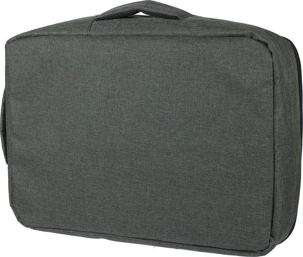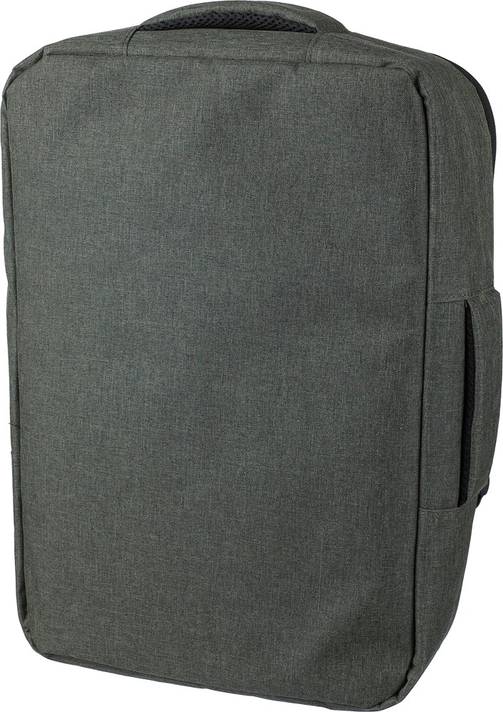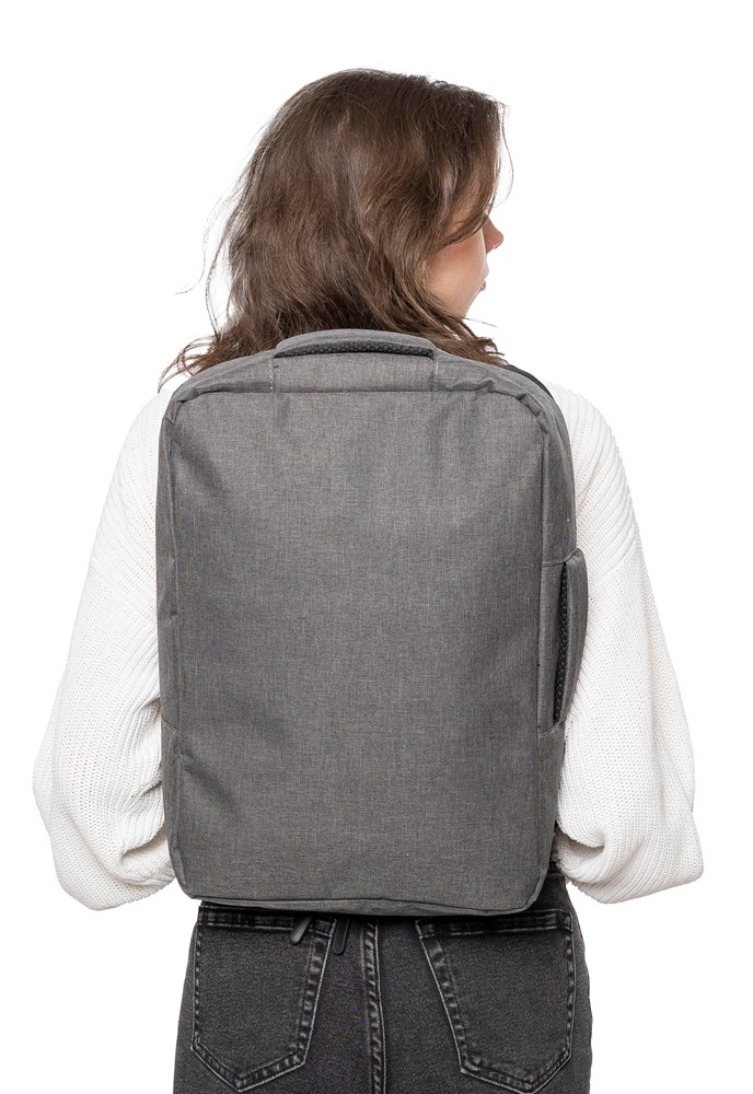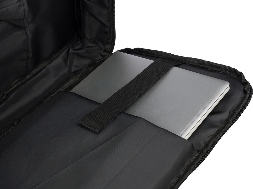 Laptop-Rucksack aus 300D-Polyester mit 210D-RPET-Futter. Er verfügt über ein großes Reißverschlussfach mit mehreren Fächern, ein Laptop-Fach mit Klettverschluss für einen 15””-Laptop und hat ein Fassungsvermögen von 12 Litern. Zur Ausstattung gehören eine verstärkte, belüftete Rückwand, verstellbare Schultergurte, ein seitlicher Tragegriff und ein Trolley-Gurt. Tragkraft: 10 kg.