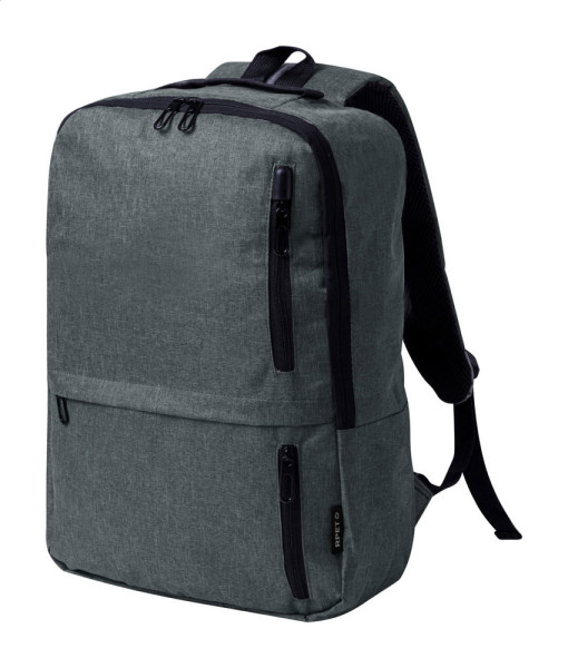 RPET-Rucksack mit Reißverschlussfächern, gepolstertem Laptop- (15") und Tabletfach (10"), gepolstertem Rücken und Schultergurten. Material: 600D RPET-Polyester. Mit RPET-Label.