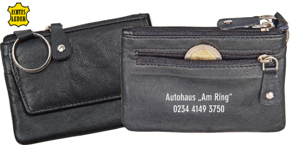 Schlüsseltasche „NOBEL“ aus ECHTEM LEDER mit zusätzlichem Kleingeldfach und Reißverschlußtasche auf der Rückseite. (Format: 115 x 80 mm)