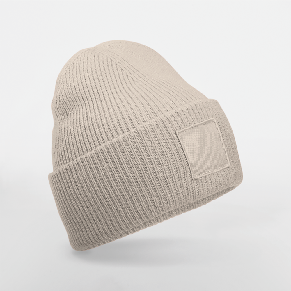 100 % recycelter Polyester. Strickgewebe. Krempe mit versteckter Befestigung für maximalen Komfort. Dekorativer Patch aus farblich abgestimmtem Baumwoll-Serge mit breiter Krempe für eine optimale Dekoration.