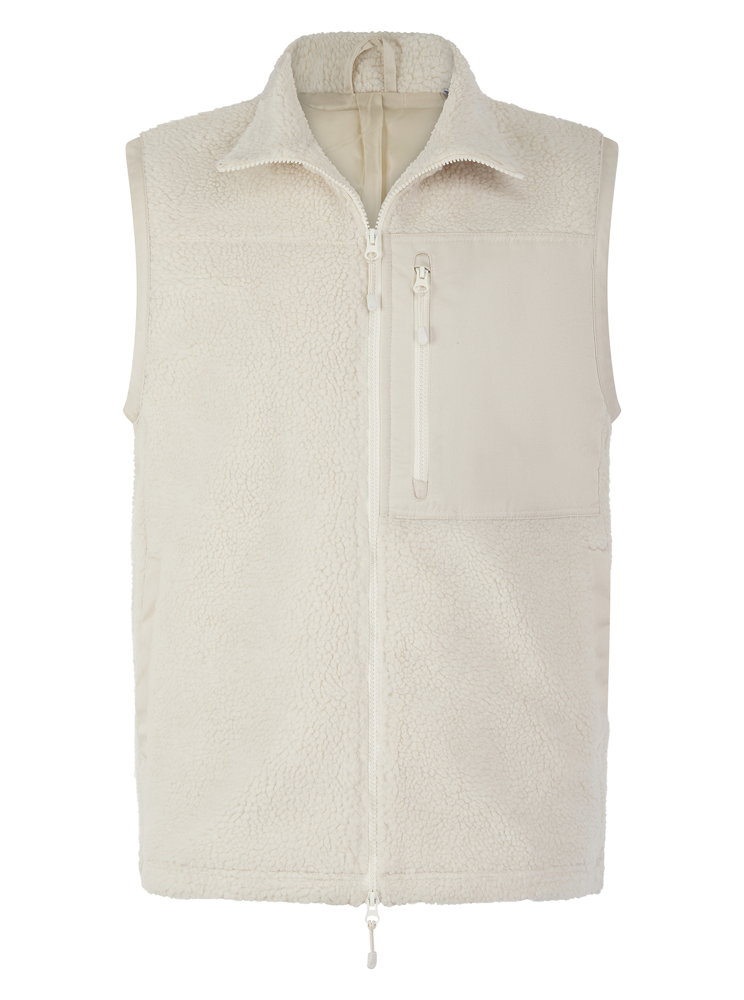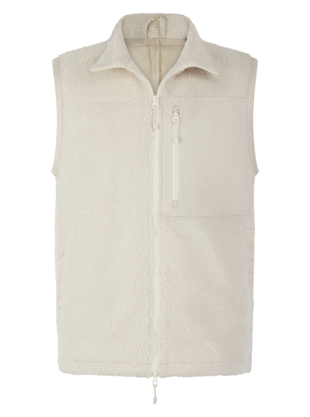 100% recycelter Polyester. Weste mit Reißverschluss und flach genähten, kontrastierenden Twill-Panels. Vordere Brusttasche mit Reißverschluss und paspelierte Seitentaschen mit Druckknopfverschluss.