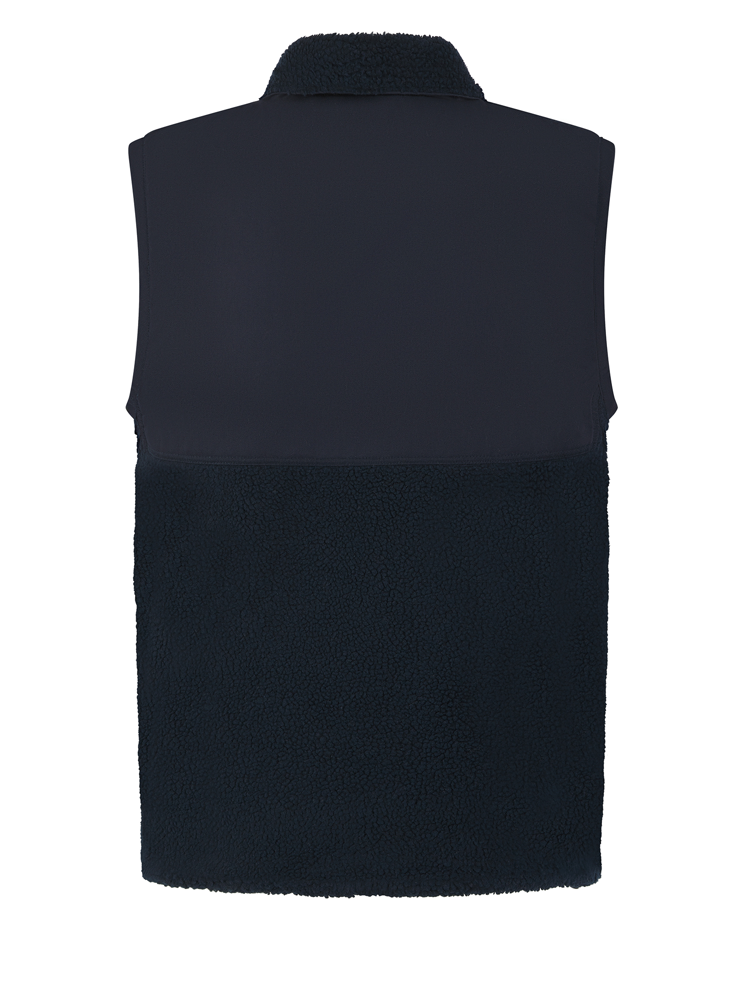 100% recycelter Polyester. Weste mit Reißverschluss und flach genähten, kontrastierenden Twill-Panels. Vordere Brusttasche mit Reißverschluss und paspelierte Seitentaschen mit Druckknopfverschluss.