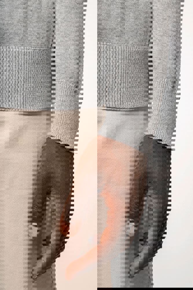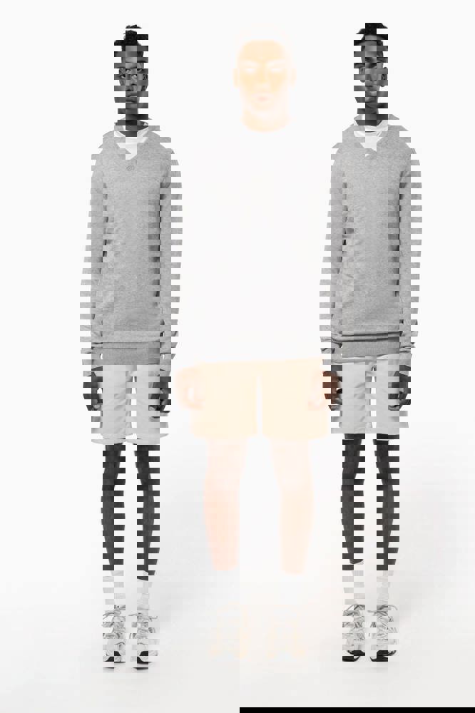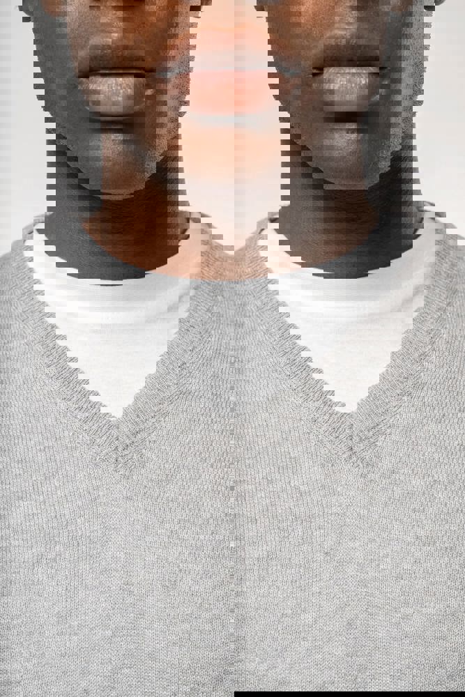 50 % Baumwolle / 50 % Polyester. Aus 50 % biologischer Baumwolle und 50 % recyceltem Polyester post-consumer. 12 gg Strick. Fully Fashion-Strick. Gerader Schnitt. Set-in-Ärmel. V-Ausschnitt mit 1 x 1-Rippstrick und feinen, kontrastfarbenen 3-mm-Streifen auf der Krageninnenseite. 1x1-Strickbündchen an Ärmeln und Saum. Markenetikett zum Abreißen