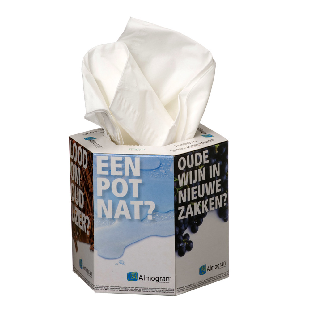 Hexagonal, Taschentücher-Box, 100 x 2-lagig unbedruckte Tücher. Abmessungen Taschentücher: 21,0 x 18,0 cm. Enthält 100 x 2-lagige Taschentücher oder auf Anfrage auch 70 x 3-lagige Taschentücher. Offsetdruck 4C
