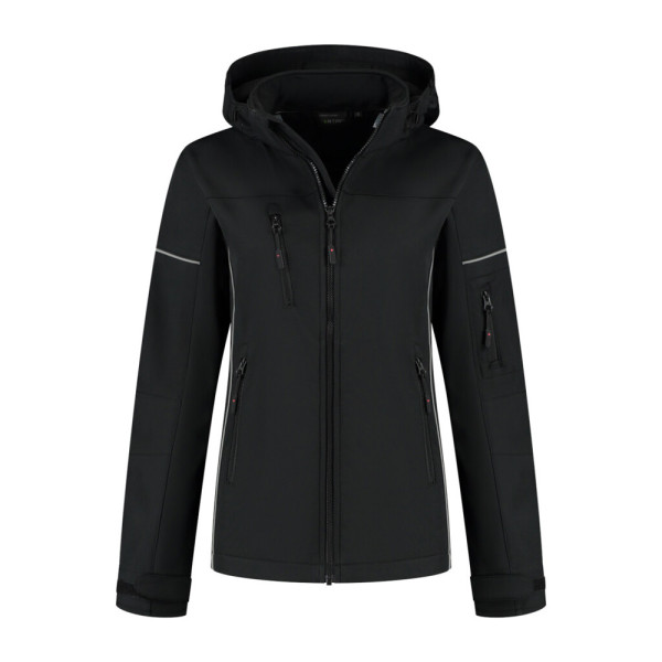 Softshelljacke mit Kontrastpaspelierung, 94 % recyceltes Polyester / 6 % Elasthan (GRS-zertifiziert), 310 g/m², 3-lagige Softshell, Ladies fit (Damenpassform) mit Stehkragen und abnehmbarer Kapuze, 2 Eingrifftaschen, Brusttasche und Ärmeltasche mit YKK-Reißverschluss, verstellbares Ärmelende mit Klettverschluss, und Manschette als Windschutz an der Innenseite, winddicht, atmungsaktiv, wasserabweisend und unterer Saum verstellbar mit Kordel/Stopper, 3D-Logo-Transfer am Saum.