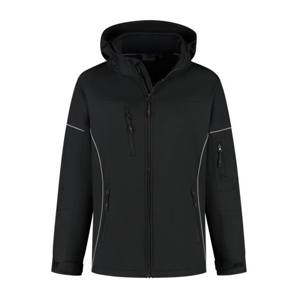 Softshelljacke mit Kontrastpaspelierung, 94 % recyceltes Polyester/6 % Elasthan (GRS-zertifiziert), 310 g/m², 3-lagige Softshell, Modern fit mit Stehkragen und abnehmbarer Kapuze, 2 Eingrifftaschen, Brusttasche und Ärmeltasche mit YKK-Reißverschluss, verstellbares Ärmelende mit Klettverschluss, und Manschette als Windschutz an der Innenseite, winddicht, atmungsaktiv, wasserabweisend und unterer Saum verstellbar mit Kordel/Stopper, 3D-Logo-Transfer am Saum.