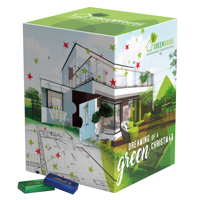 Adventskalenderturm in Vollkartonhülle mit recycelbarem Inlay, rundum individuell bedruckt Innen im Tower ist Platz für ein besonderes Geschenk. Inhalt: 24 Sarotti Schokoladentäfelchen in 4 verschiedenen Sorten (Vollmilch, Zartbitter, Haselnuss, Gianduja) bunt gemischt.