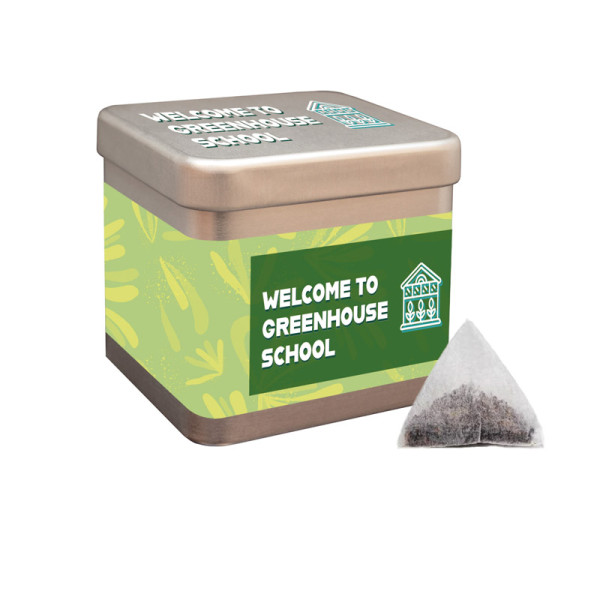 Silbermatte, quadratische Dose mit drei Veredelungsoptionen: Sie haben die Wahl zwischen Direkt-Digitaldruck auf dem Deckel, einem vierfarbigen 4-C-Etikett am Korpus oder einer Kombination aus beiden Veredelungen für maximale Markenwirkung. Befüllt wird diese kompakte Dose mit Tee-Pyramiden der Marke Meßmer. Der Vorteil bei dieser Füllung ist, dass man die Dose zu jeder Jahreszeit einsetzen kann.